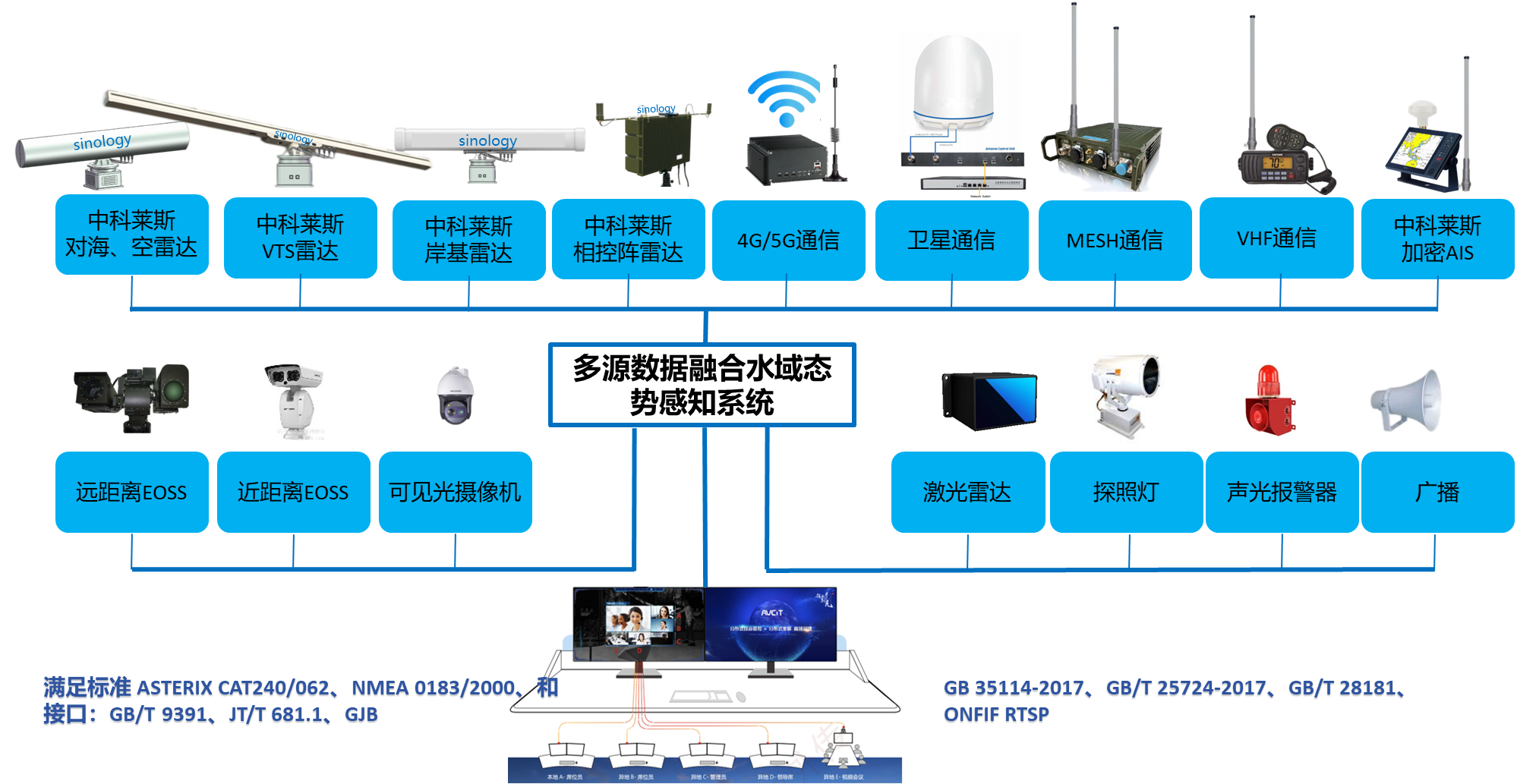 | 多源数据融合水域态势感知系统前端感知设备包括雷达、AIS/S-AIS、光电、VHF、北斗、无人机等不少于10种以上传感器,能够实时对船舶、摩托艇、低空飞行器等对海面目标进行全方位、大范围、多目标的快速搜索、识别、定位,实时生成目标态势,对可疑目标自动报警、对指定目标持续跟踪定位,通过多源数据融合与信息研判,实现对探测目标的实时监测预警,为整个监控水域建立统一共享态势。 | ![]() |