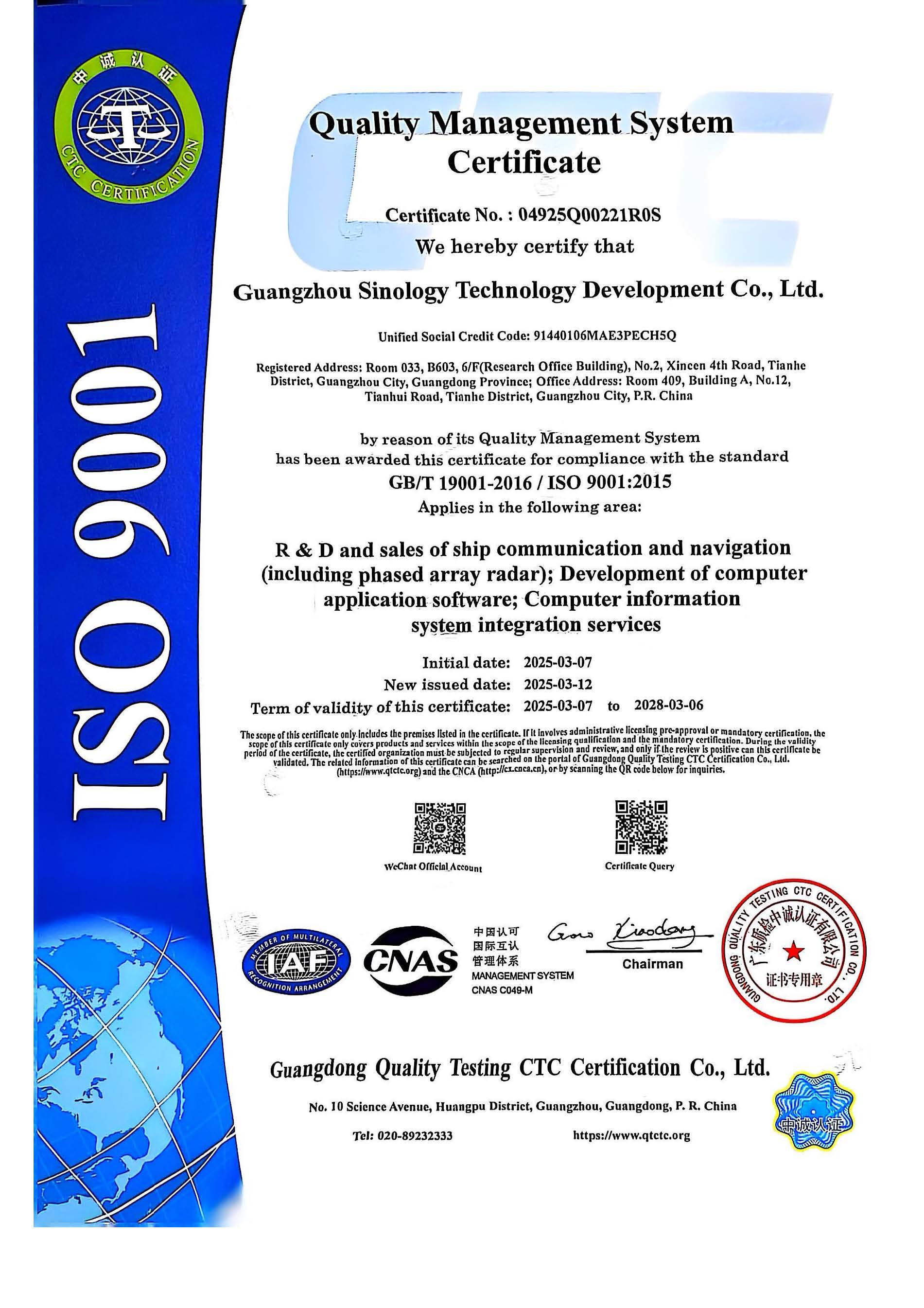 Sinology International Company Limited(“Sinology”)is mainly engaged in the research and application of high-tech maritime situational awareness system technologies such as radar and Secure AIS. It has successively launched products such as solid-state coherent phased array security radar, shore based Secure AIS base station, shipborne Secure AIS,VTS Vessel Traffic Radar, phased array waterway surveillance radar, new generation solid-state high gain VTS radar, radar target data processors, multi-source data fusion interface intelligent processors, maritime situational awareness system software platform, intelligent waterway monitoring and early warning information systems, Bridge Anti-collision Active Warning System, and maritime collaborative joint prevention and control warning systems