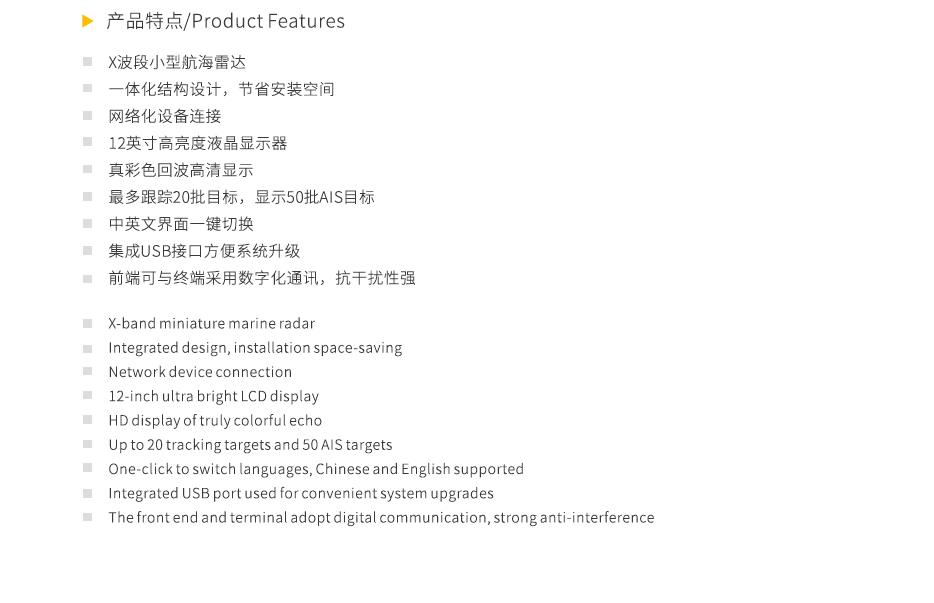 该系列雷达采用了快速目标跟踪、伪彩色目标显示等技术,带给用户最佳的使用体验。