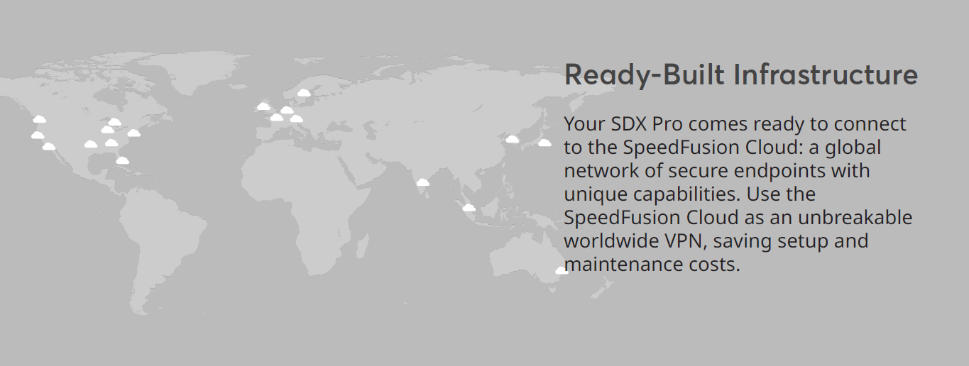SDX Pro支持SpeedFusion云连接:这是一个由具备独特功能的安全终端组成的全球网络。SpeedFusion Cloud作为全球通用的VPN解决方案,可有效节省部署与运维成本。