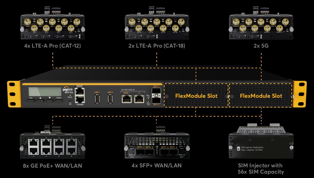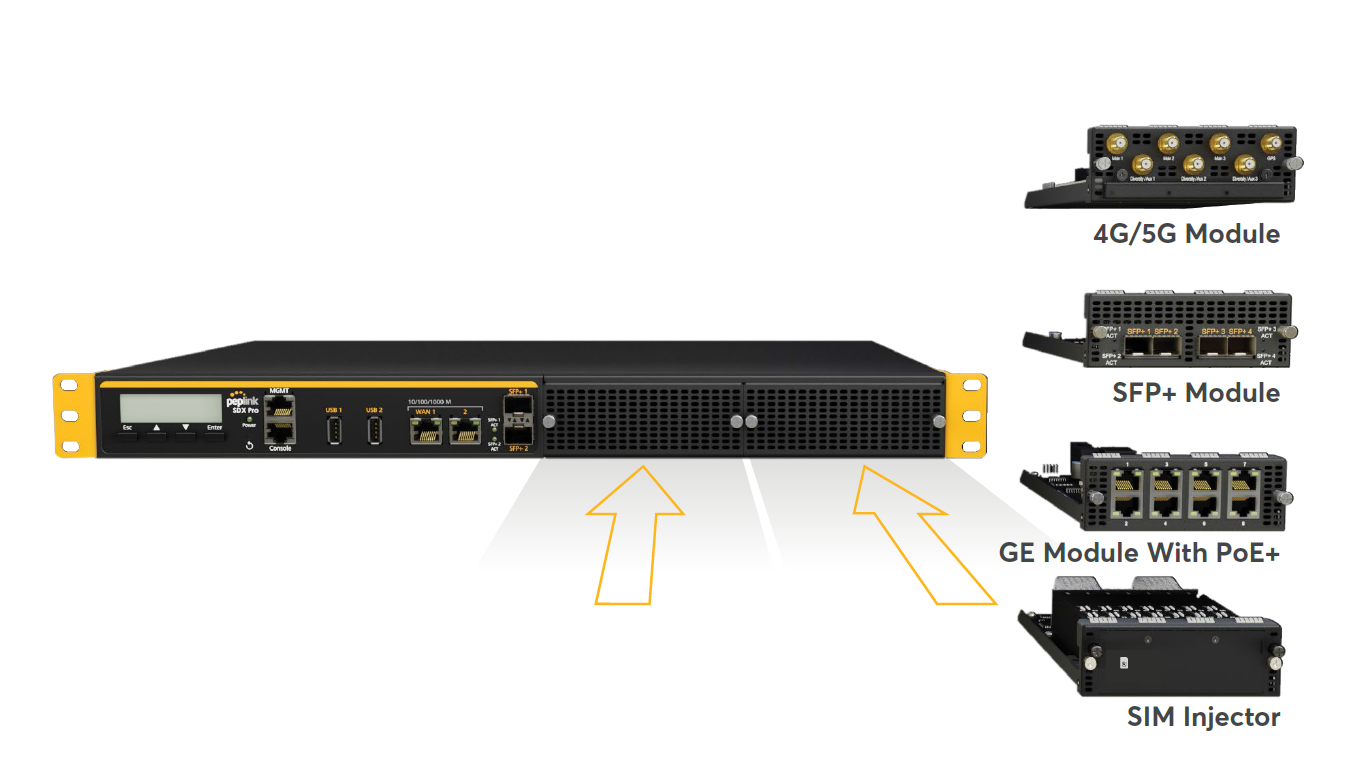 Peplink SDX PRO 提供强大的灵活性和功能性,它拥有两个FlexModule 插槽,使您能够使用不同的模块对设备进行定制,以适应各种部署需求。它支持边缘计算,因此能够向连接的设备传输网站、应用程序和 Docker 容器。