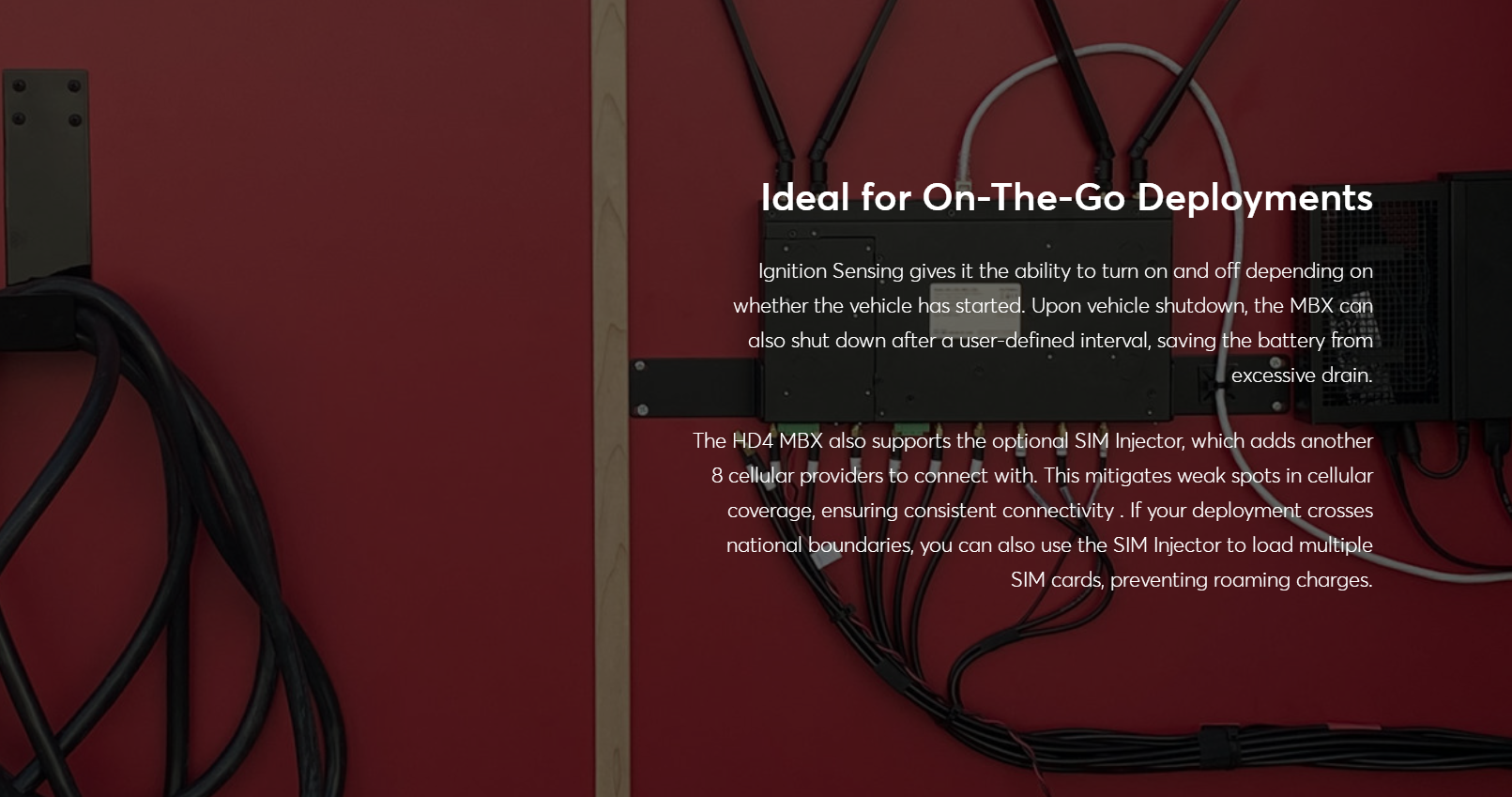 HD4 MBX 还支持可选的 SIM 卡扩展器,可额外接入 8 家蜂窝网络供应商,从而消除信号覆盖薄弱点,确保持续稳定的连接。若部署场景跨越国界,亦可使用 SIM 卡扩展器加载多张 SIM 卡,有效避免漫游费用。