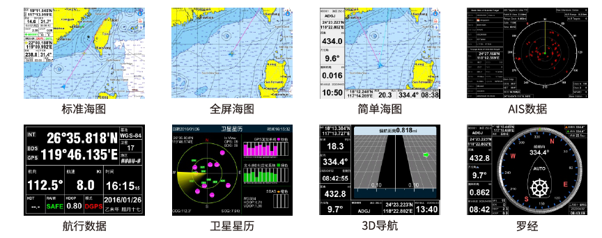 采用科技美学设计,集多种显示模式为一体,包括标准海图、全屏海图、简单海图、AIS数据、航行数据、卫星星历、3D导航、罗经等多个用户界面。