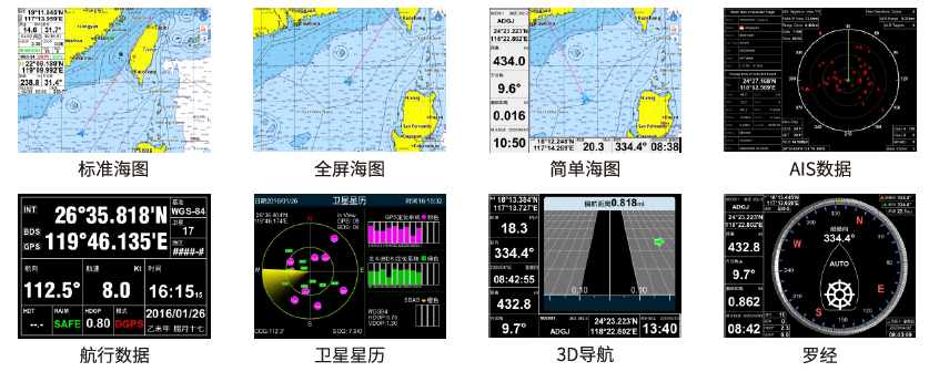 採用科技美學設計,集多種顯示模式為一體,包括標準海圖、全屏海圖、簡單海圖、AIS數據、航行數據、衛星星曆、3D導航、羅經等多個用戶介面。